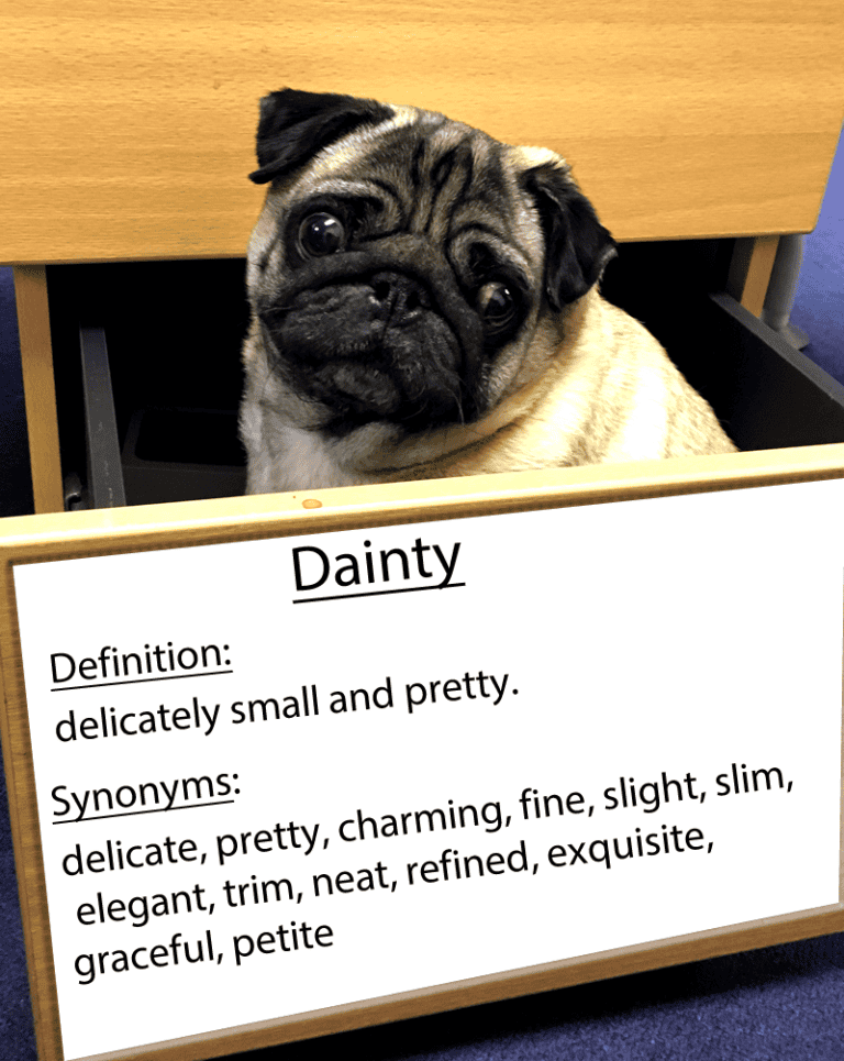 Dainty Definition: delicately small and pretty. Example: “a dainty lace handkerchief” Synonyms: delicate, pretty, charming, fine, slight, slim, elegant, trim, neat, refined, exquisite, graceful, petite