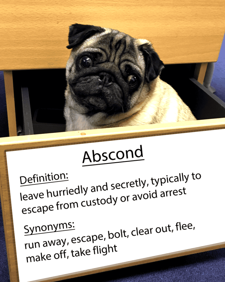 Abscond- Definition: leave hurriedly and secretly, typically to escape from custody or avoid arrest Example: “the barman absconded with a week’s takings” Synonyms: escape, bolt, clear…
