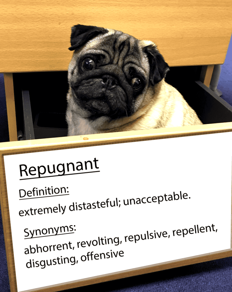 Read moreRepugnant Definition: Extremely distasteful; unacceptable. Example: cannibalism seems repugnant to us Synonyms: abhorrent, revolting, repulsive, repellent, disgusting, offensive.